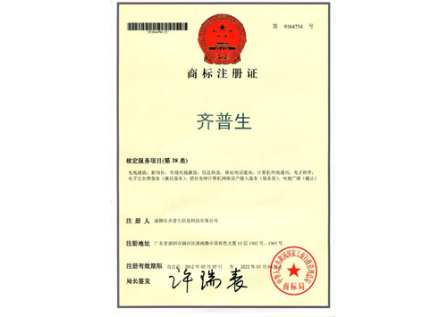 齊普生商標注冊證